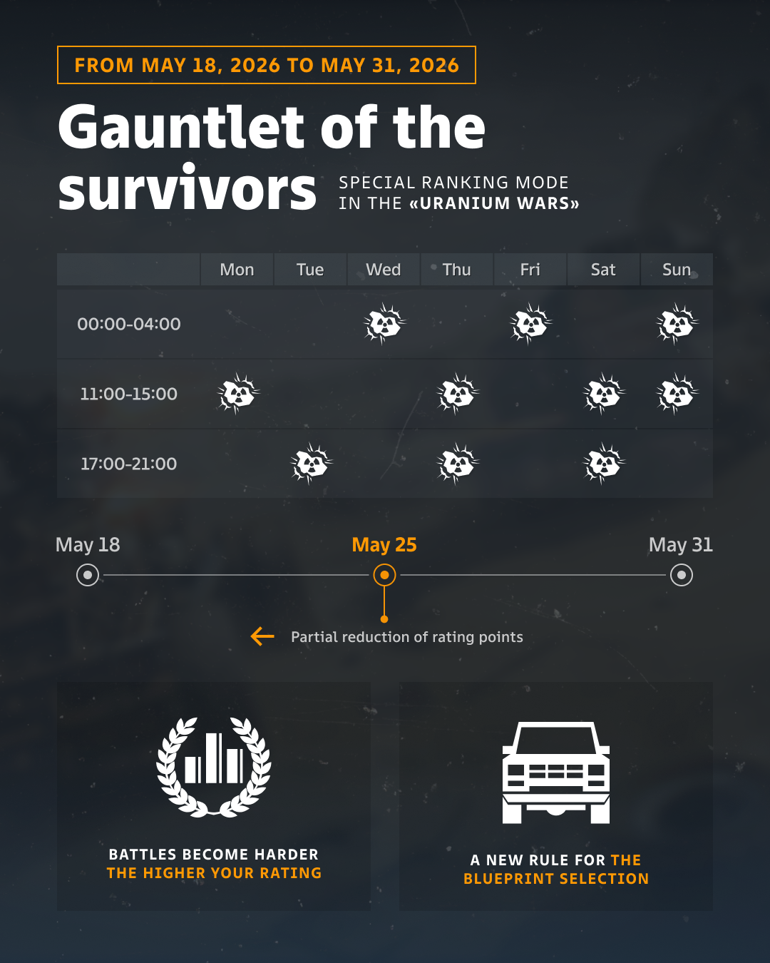 The first iteration of the alternative ranked mode “Gauntlet of the survivors” will launch in May! We’ve developed special rules for this new event to ramp up the competitive edge: battle conditions get tougher as your rank rises, and the blueprint selection system has received a major update. Intrigued? Let’s dive in!