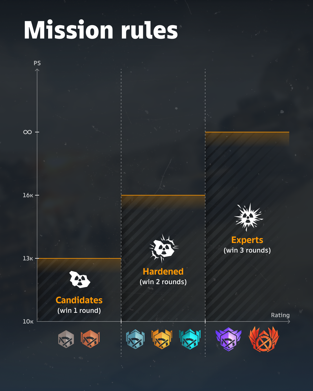 The mode is divided into three categories: “Candidates”, “Hardened”, and “Experts”. Getting into the right category is easy: it’s determined automatically based on your rating. If you play as a group, the highest rating among the participants will determine the group’s rating.