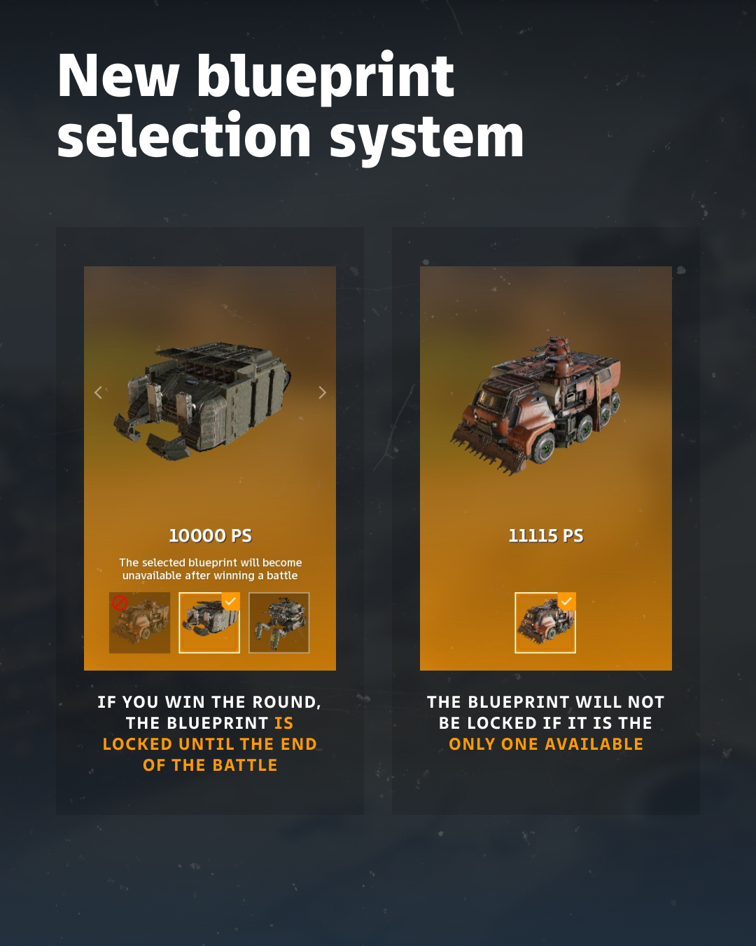 The “Hardened” and “Experts” categories have an updated blueprint selection mechanic. If you win a round using a specific blueprint, it is locked and becomes unavailable for the remainder of the battle, unless it is your only available option.