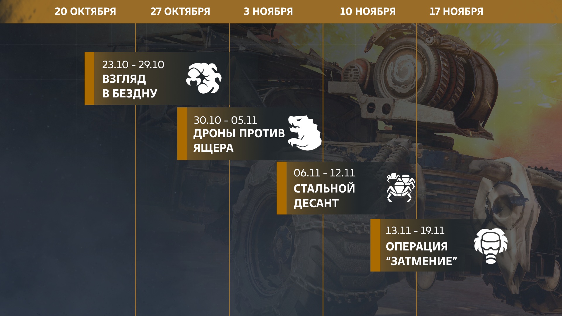 Сразу 2 новые потасовки, возвращение любимых режимов «Стальной десант» и «Операция: Затмение», событие на Хэллоуин с праздничным станком и украшенные локации — всё это ждет вас в обновлении!